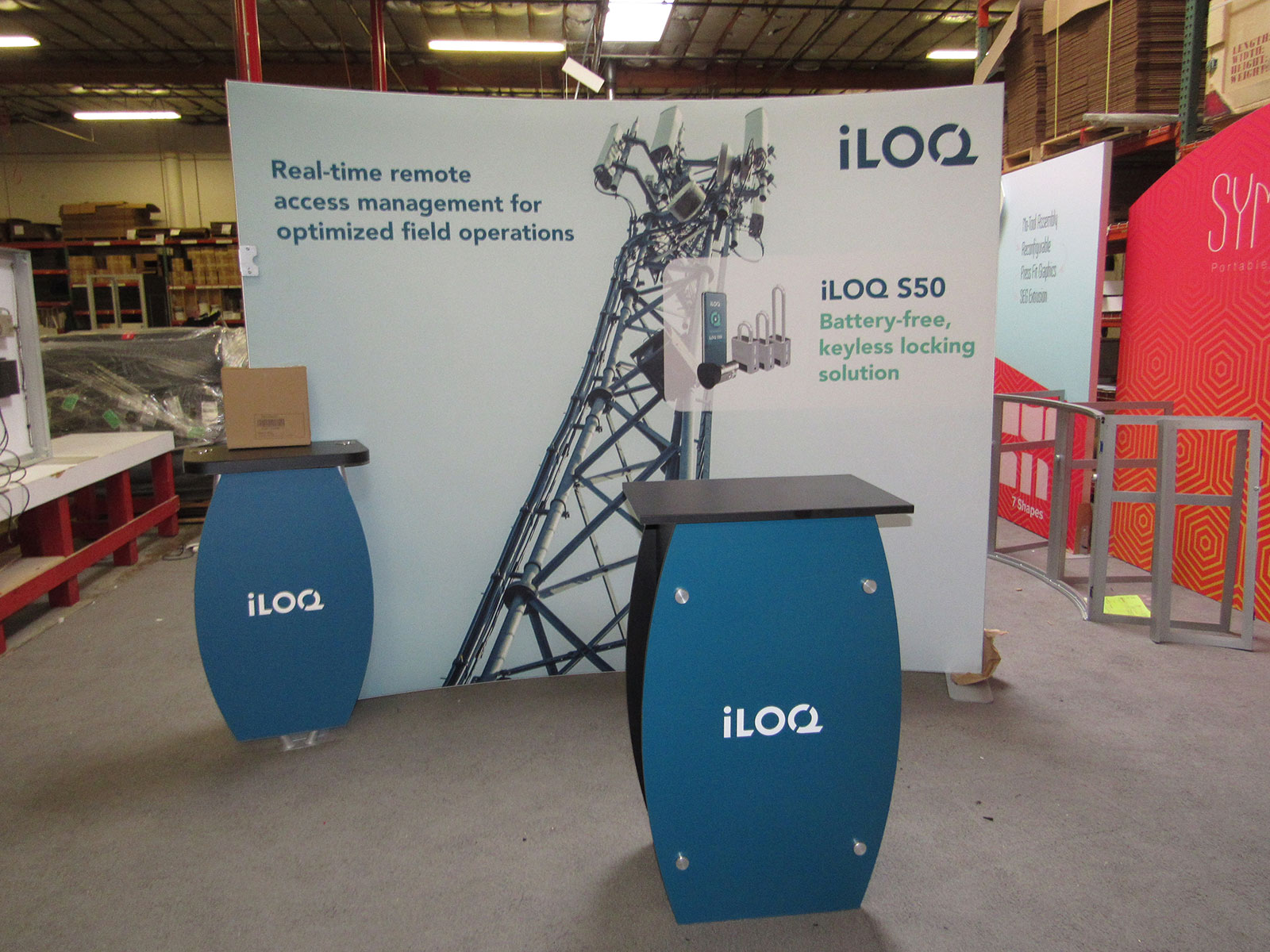 SYK-1014 Symphony Portable Display with SYM-408 Locking Counter, Monitor Mount, SEG Fabric Graphics, and Backwall Workstation with Wireless Charging