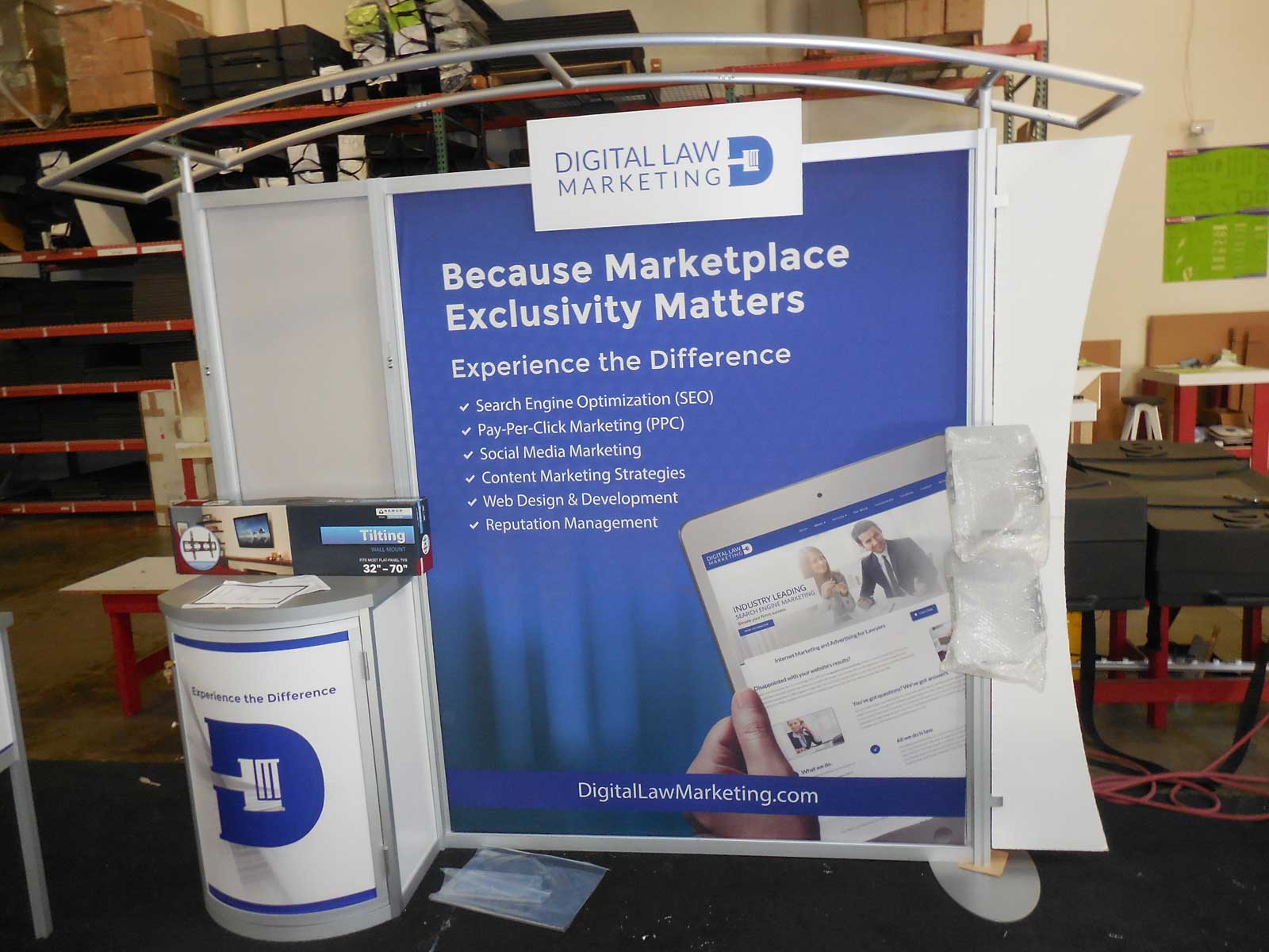 Modified VK-1321 Visionary Designs Hybrid Exhibit with Metal Canopy, Fabric Graphics, Workstation, and Monitor Mount