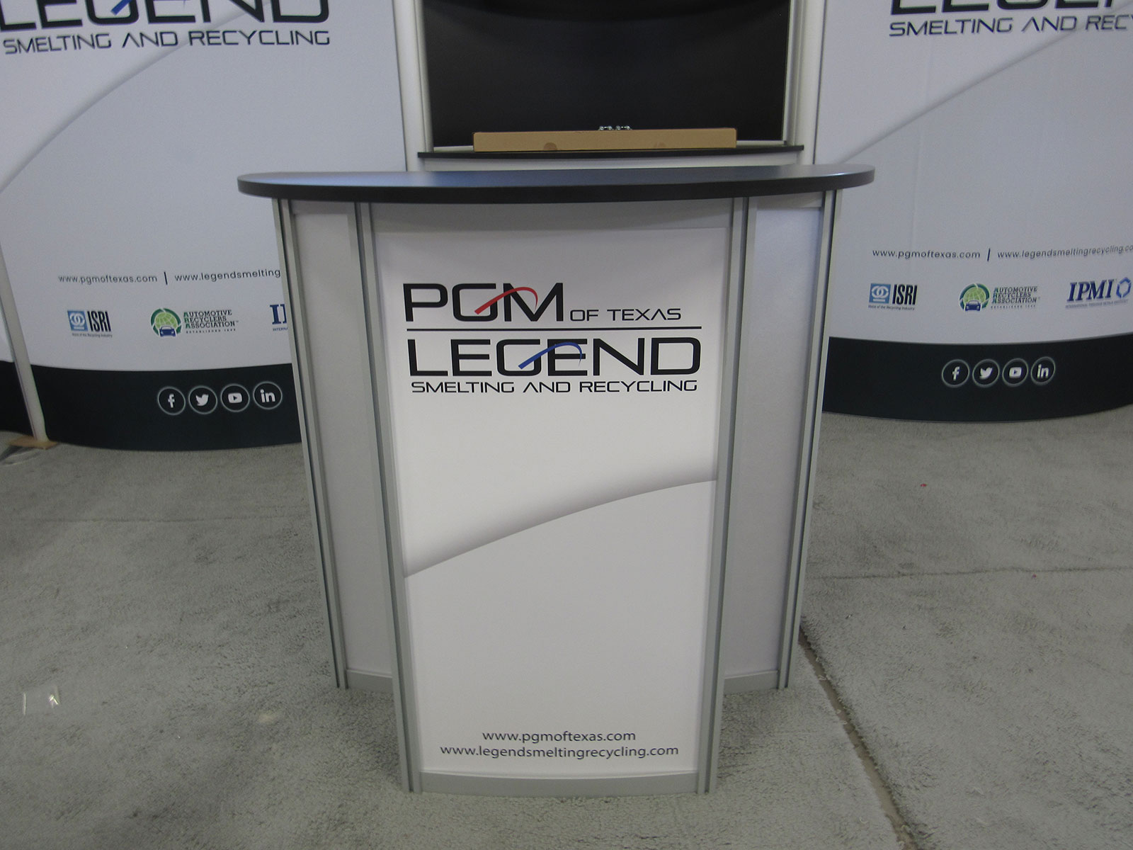 ECO-2018 Sustainable Exhibit with a Recyclable Aluminum Frame, Eco-friendly Fabric Graphics, Locking Storage, Large Monitor Mount, Privacy Wall, ECO-5C Counter, and LED Stem LightsECO-2018 Sustainable Exhibit with a Recyclable Aluminum Frame, Eco-friendly ECO-5C Sustainable Trade Show Counter