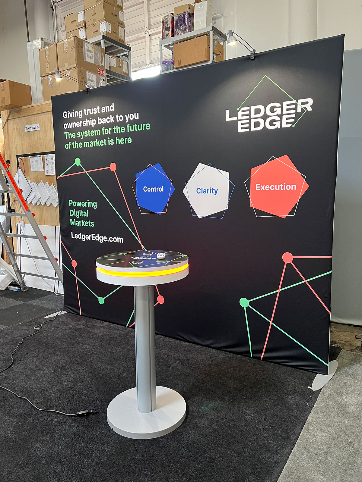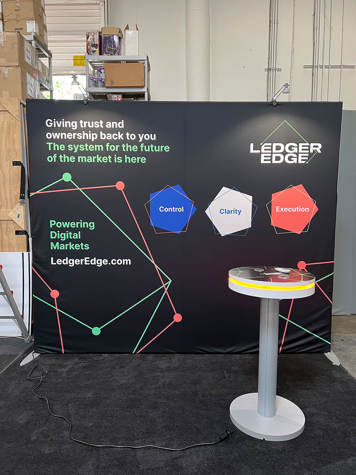 RENTAL: 10 x 10 Design, Includes RE-1021 Design with Pillowcase Fabric Graphic, (2) LED Arm Lights, RE-711 Charging Station Table with Top Surface Vinyl Graphic 10 ft. Rental Display -- View 2