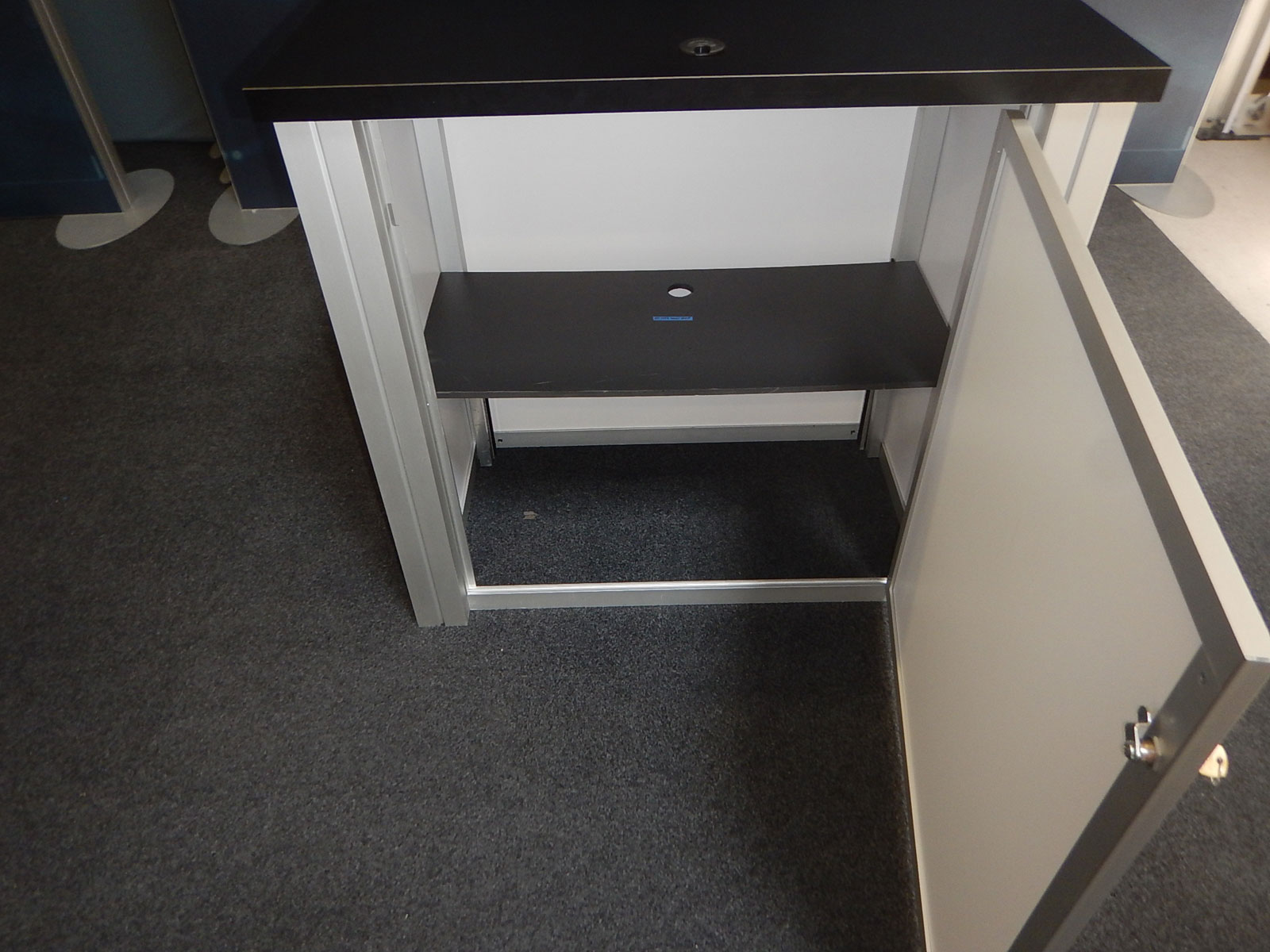 RENTAL: (2) 10' Wide x 8' High SEG Backwall Structures with Large Monitor Mounts, (2) RE-1202 Rectangular Counters, Silicone Edge Fabric Graphics, and Sintra Infill Graphics for Counters RENTAL: (2) RE-1202 Rectangular Counters with Storage