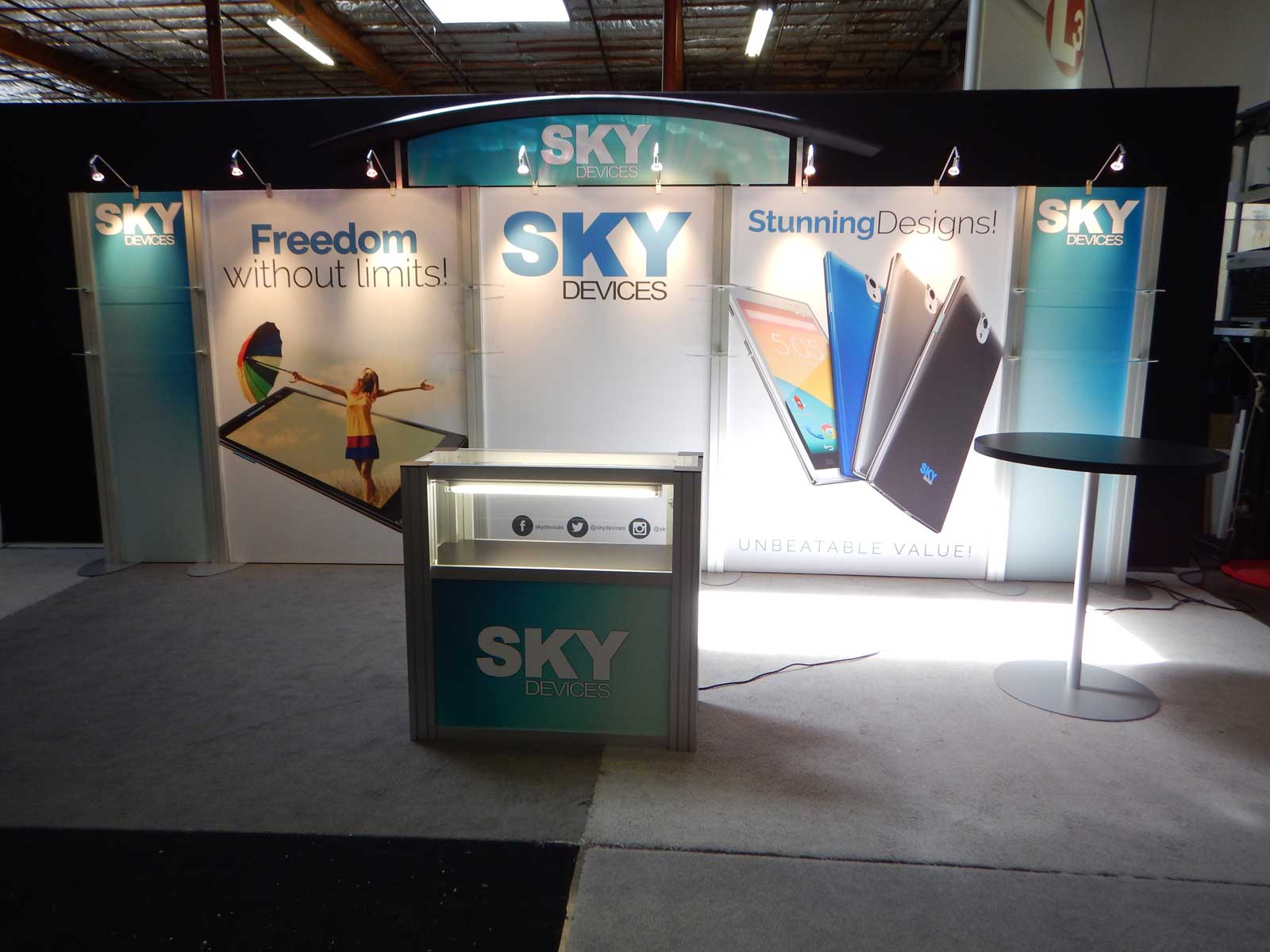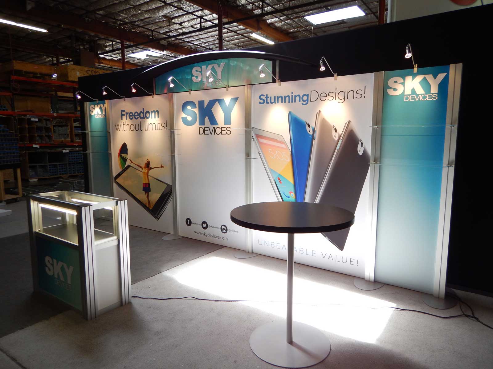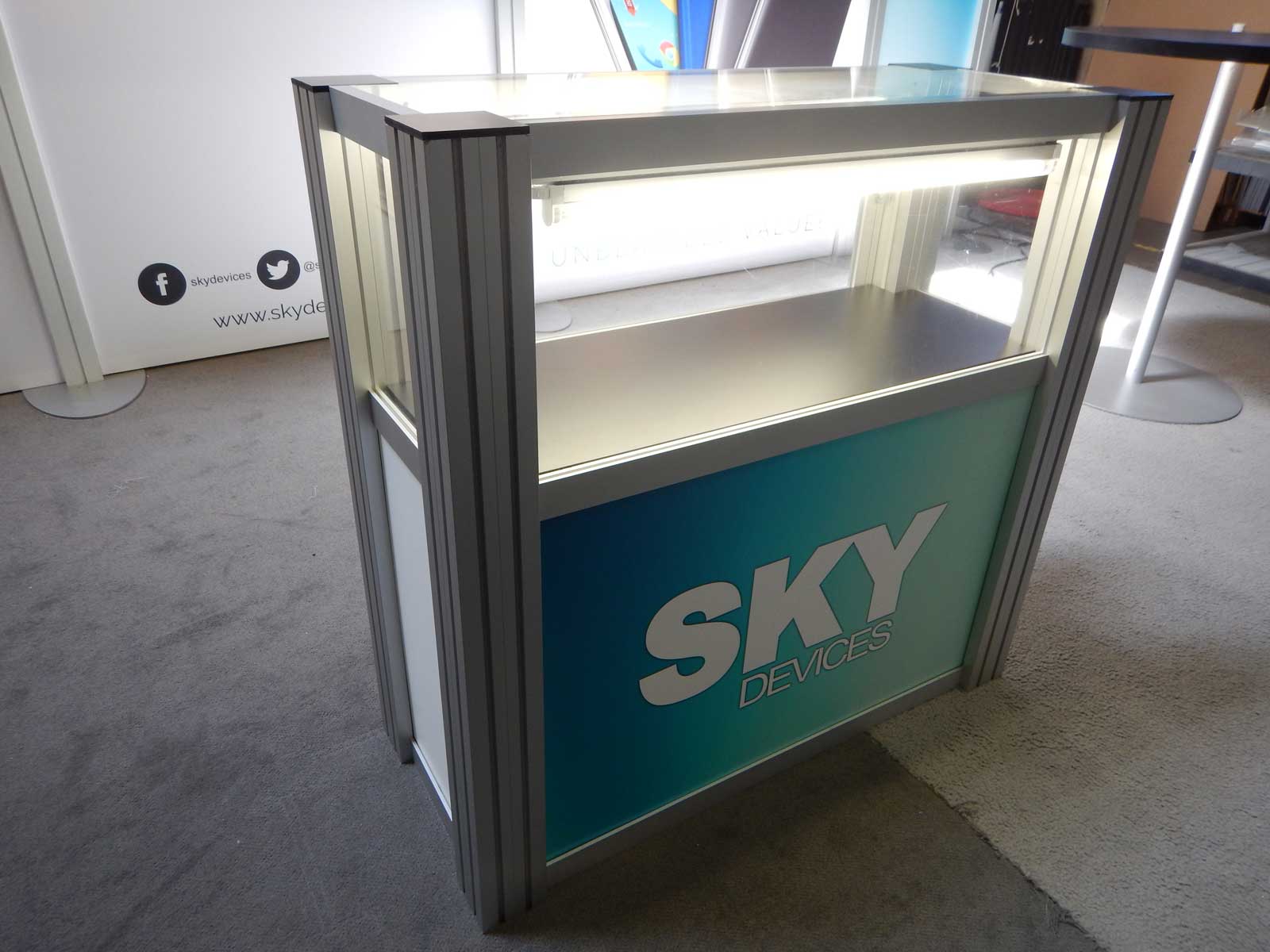 RENTAL: Modified RE-2008 with RE-502 Display Case, Round Table, Clear Acrylic Shelves, Arm Lights, Tension Fabric Graphics, and Sintra Header and Infill Graphic