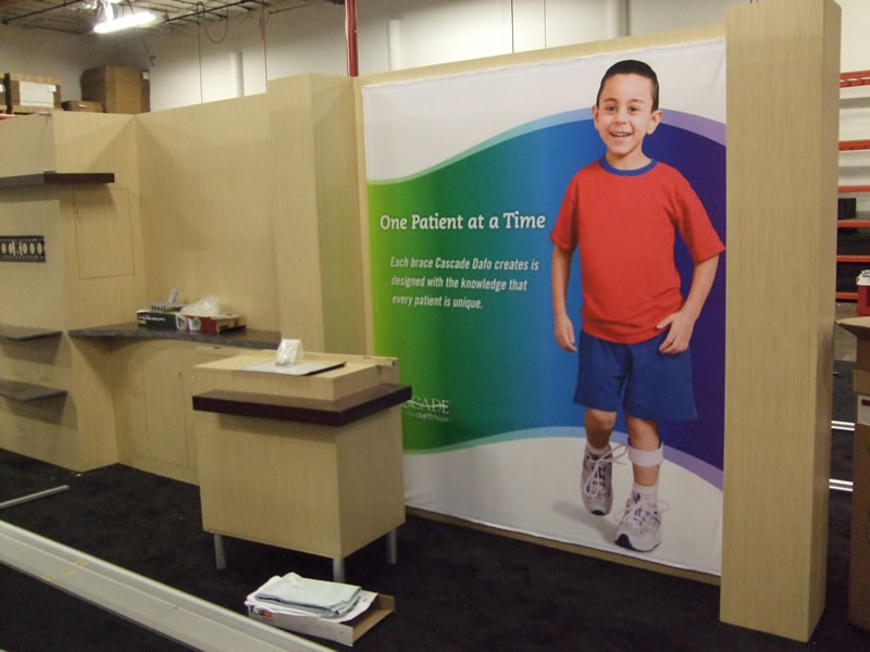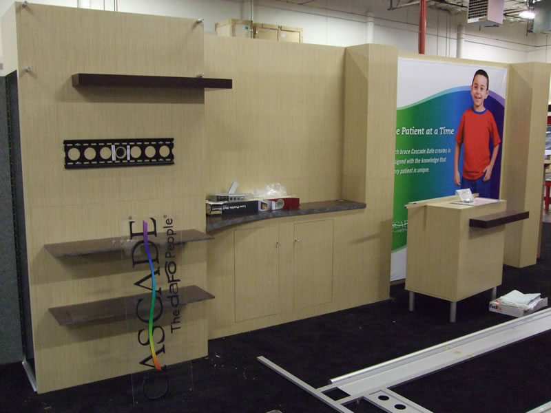 Euro LT Custom Modular Laminate Inline with Alcove Counter, Custom Pedestal, Large Screen Monitor Mount, and Tension Fabric Graphic