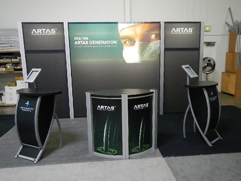 RENTAL: Hybrid Inline with Fabric Graphics, Locking Reception Counter and (2) Pedestals with iPad Mounts -- Image 1 RENTAL: Hybrid Inline with Fabric Graphics, Locking Reception Counter and (2) Pedestals with iPad Mounts -- Image 2 RENTAL: Hybrid Inline with Fabric Graphics, Locking Reception Counter and (2) Pedestals with iPad Mounts -- Image 3