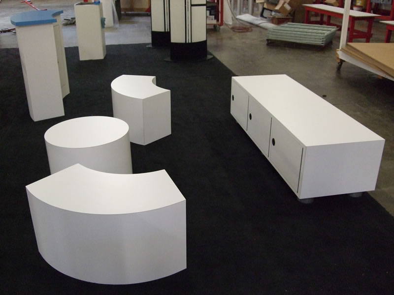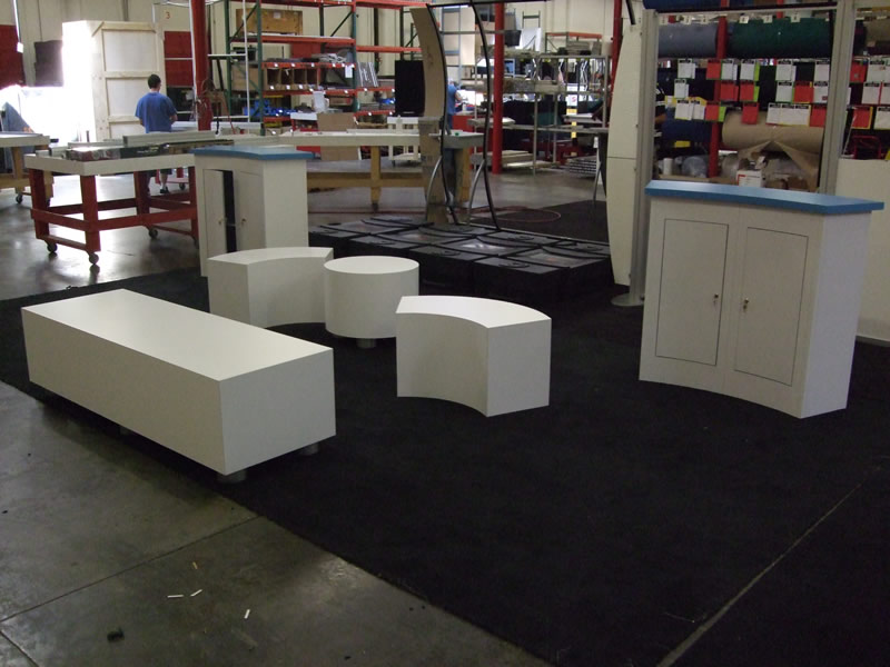 Comment: The two counters with blue countertops are modular and pack flat. The all white counters are custom, non-modular construction and shop as assembled units.