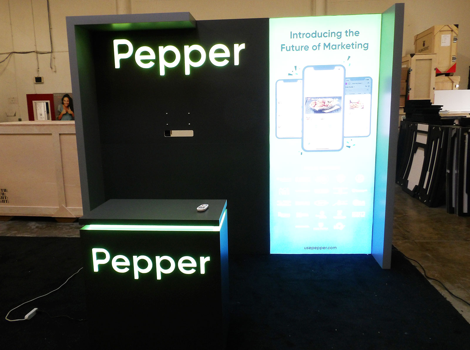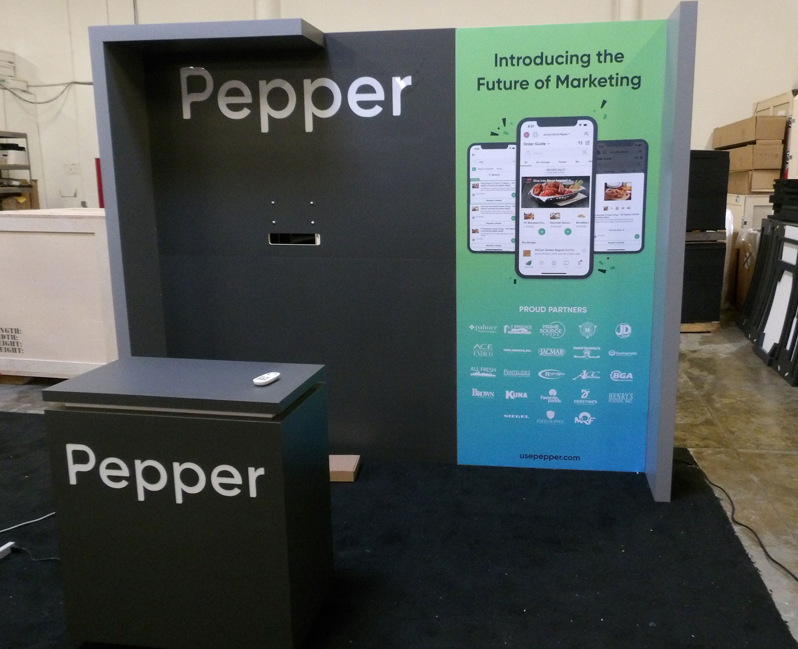 Custom 10 ft. Exhibit with Backlit Graphic, Backlit Logos, Large Monitor Mount, Custom Soffit, and MOD-1724 Reception Counter with Backlit Logo and Locking Storage [60807]