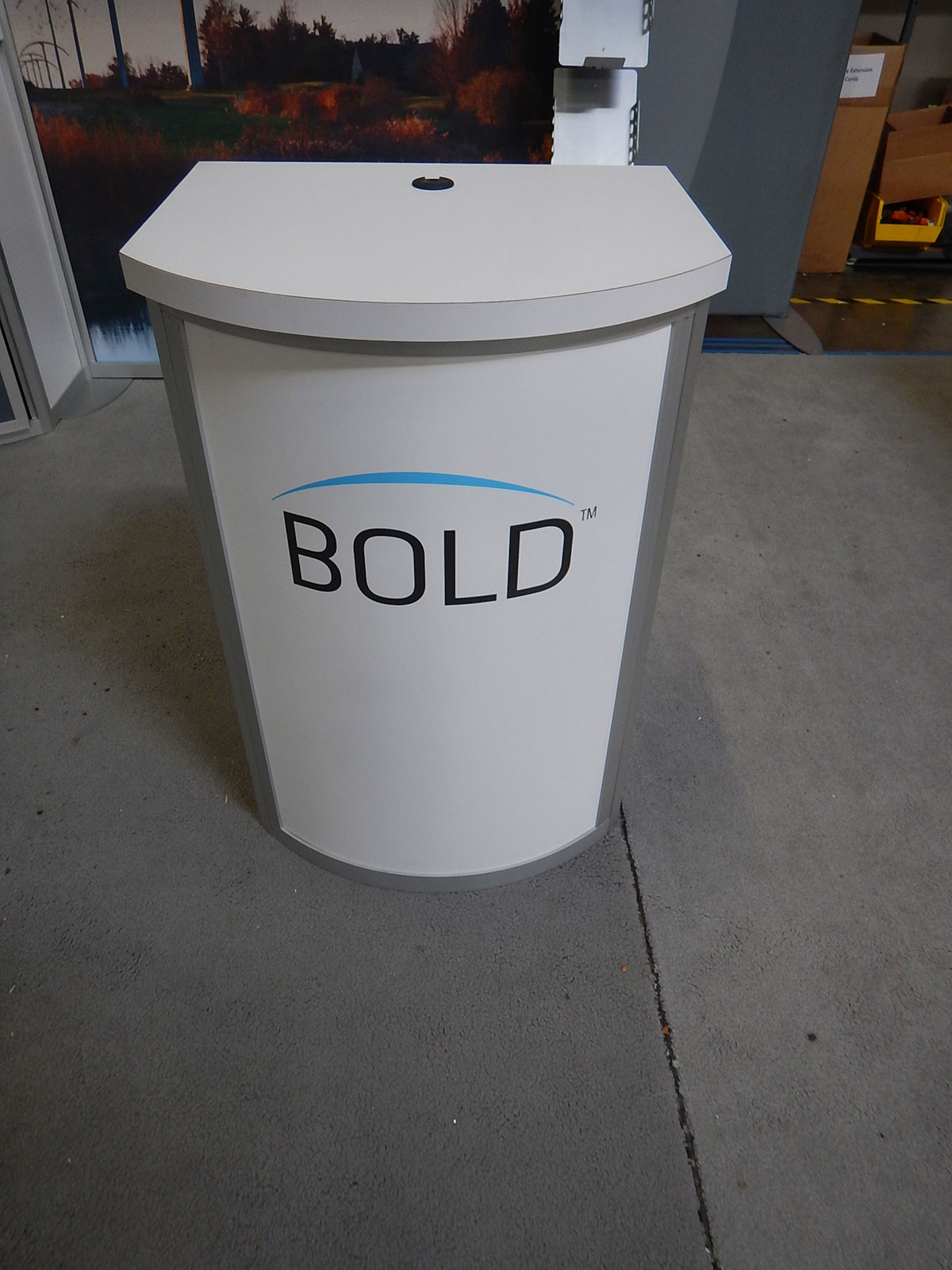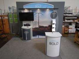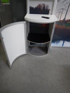 RENTAL: Inline Design with Single-Sided Lightbox, RE-1221 Reception Counter, (3) White Laminated Shelves, Silicone Edge Fabric Graphic, SEG Reflector Panel, Sintra Counter Graphic