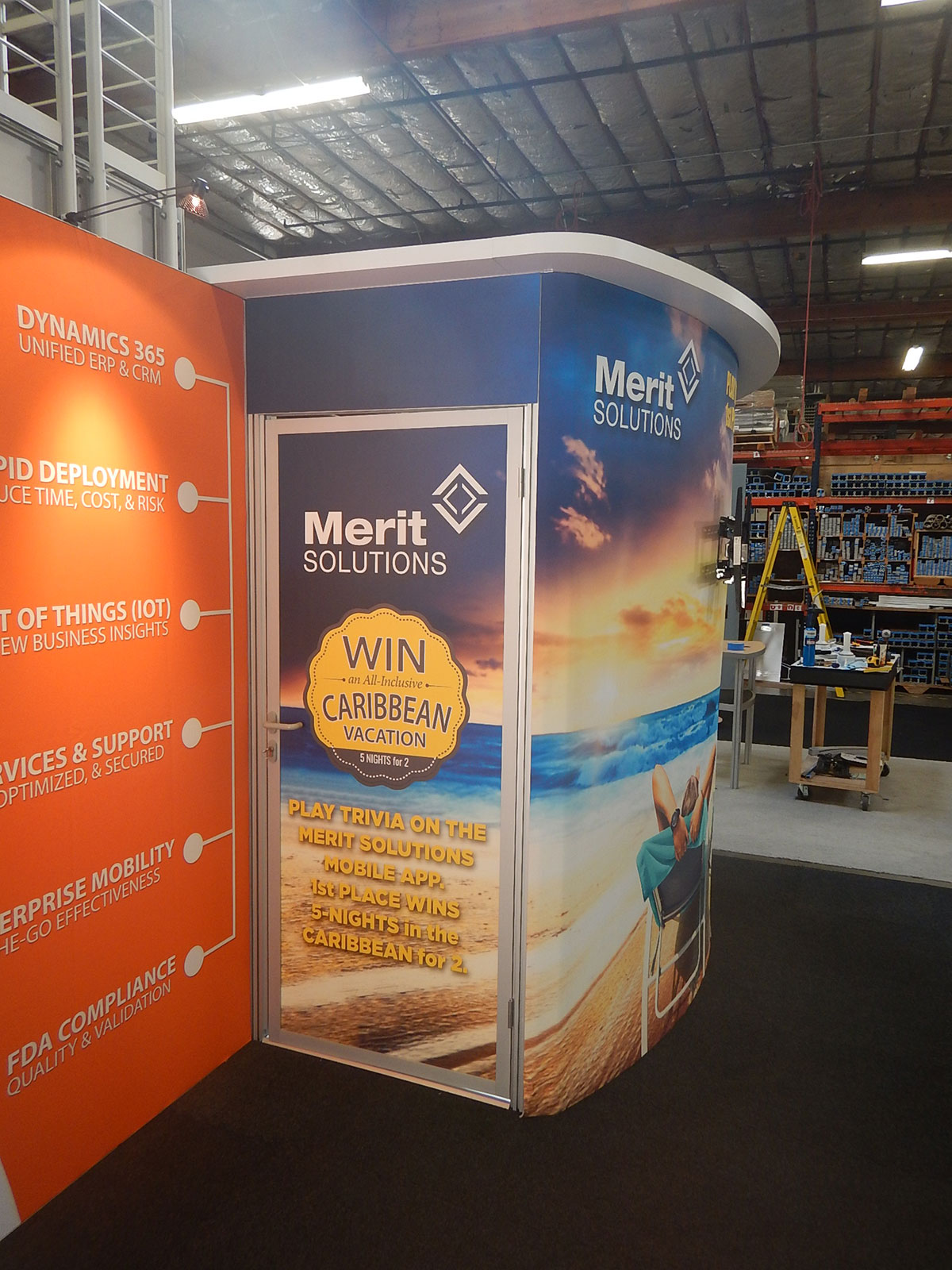 RENTAL: RE-2042 Gravitee One-Step System Panels, Includes Storage Closet with Locking Door, White Laminated Ceiling Soffit with, Large Monitor Mount, (3) Arm Lights, Silicone Edge Fabric Graphics, Sintra Door Graphic, and RE-702 Charging Station with Vinyl Graphic