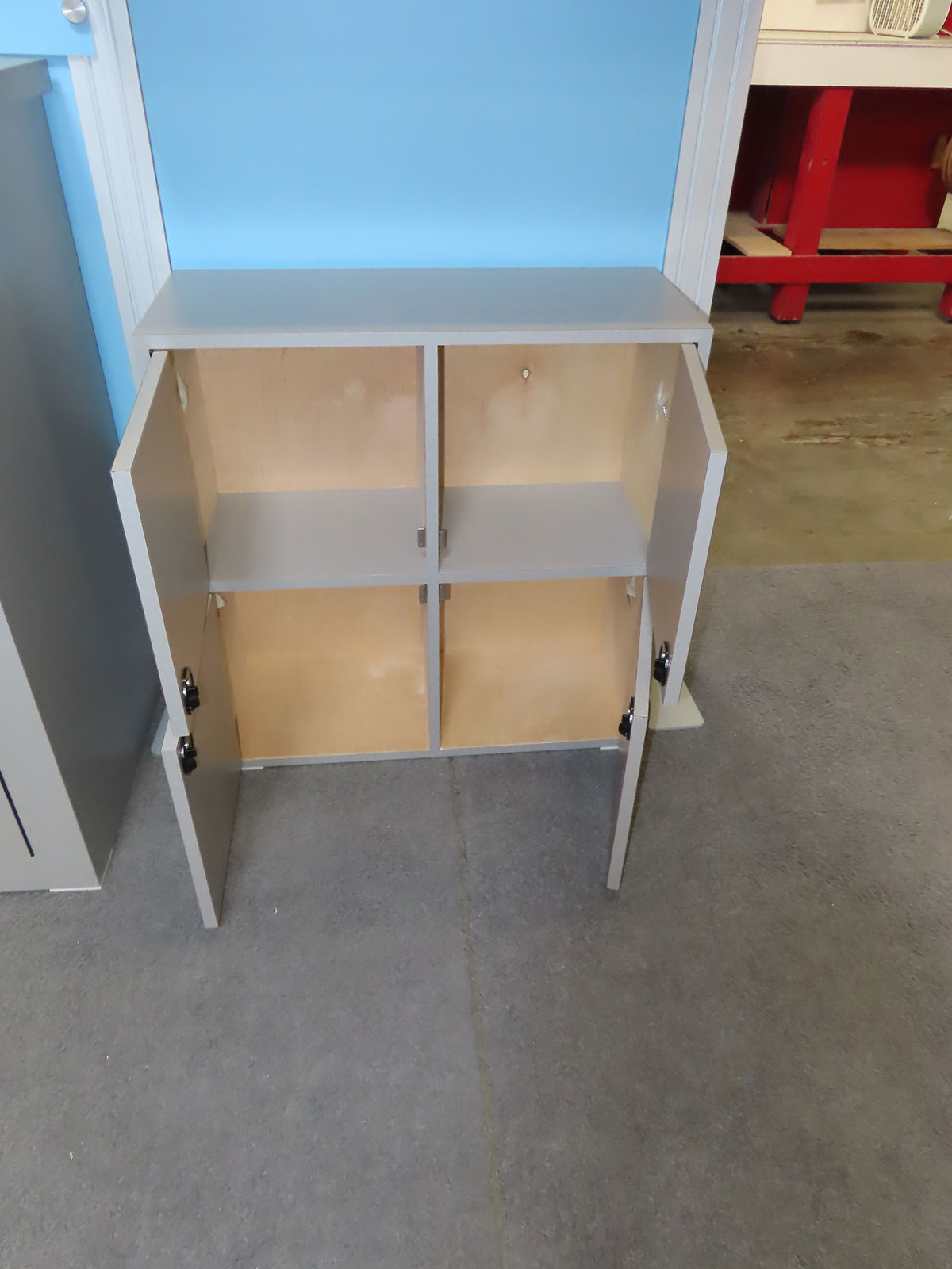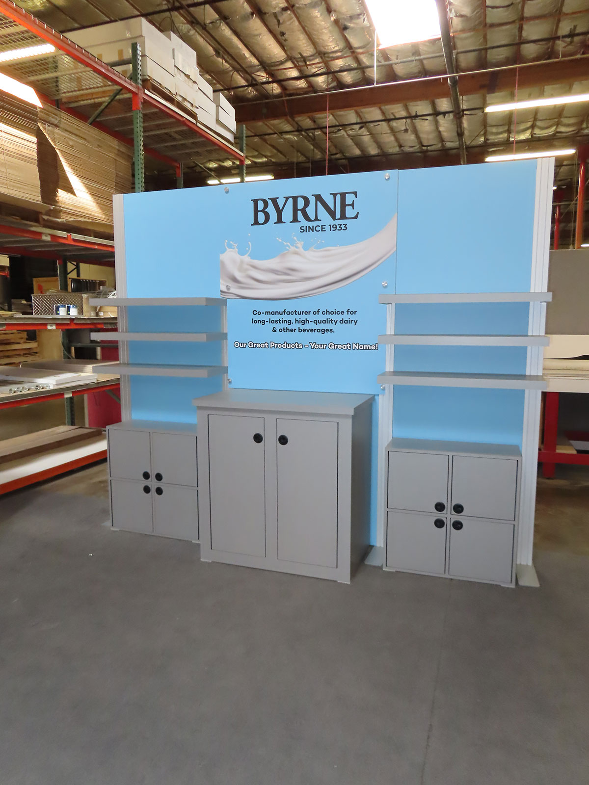 Modified VK-1360 Inline Display with Counters, Shelves, Fabric Graphics, and Locking Storage Modified VK-1360 Inline Display -- View 2 Modified VK-1360 Inline Display -- View 3 Modified VK-1360 Inline Display -- Crate Packaging