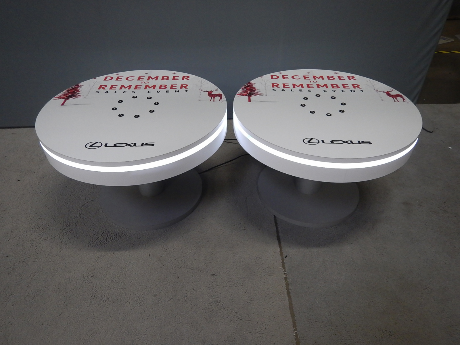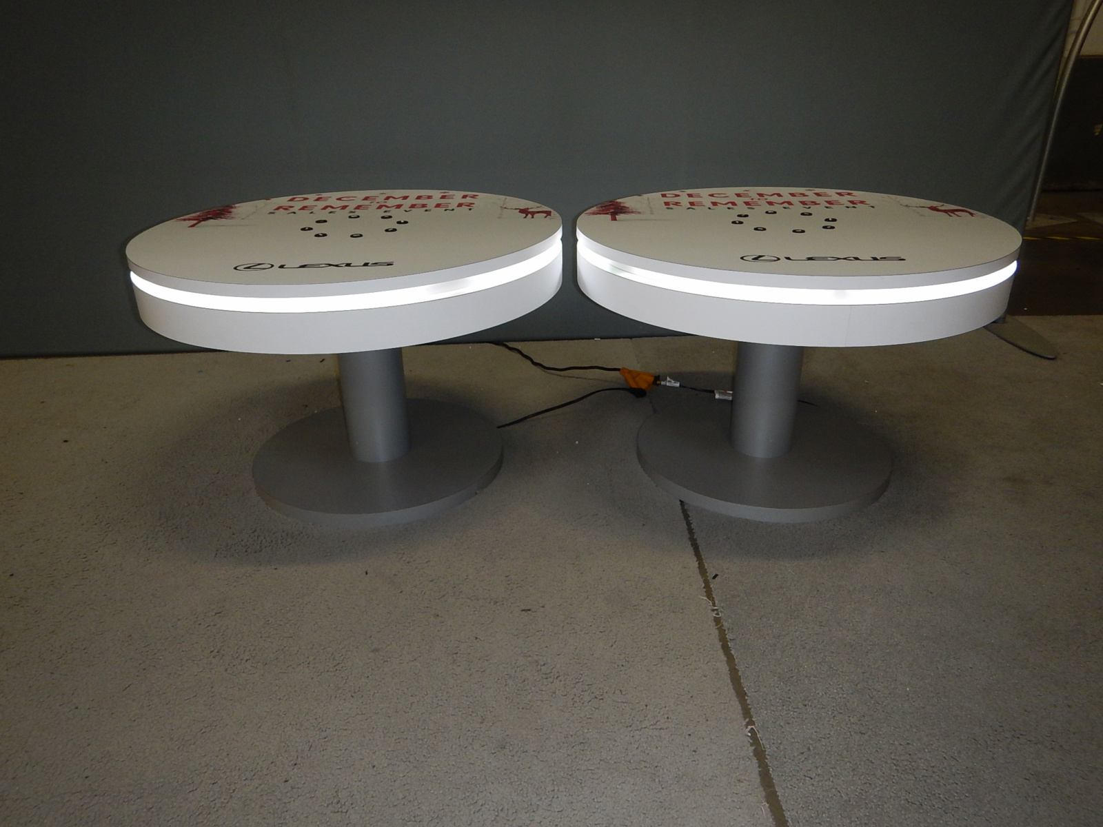 RENTAL: (2) RE-702 Charging Station Tables with 36 in. Diameter Top with RGB Adjustable LED Halo Lighting and (8) USB Ports, and Top Surface Graphics.