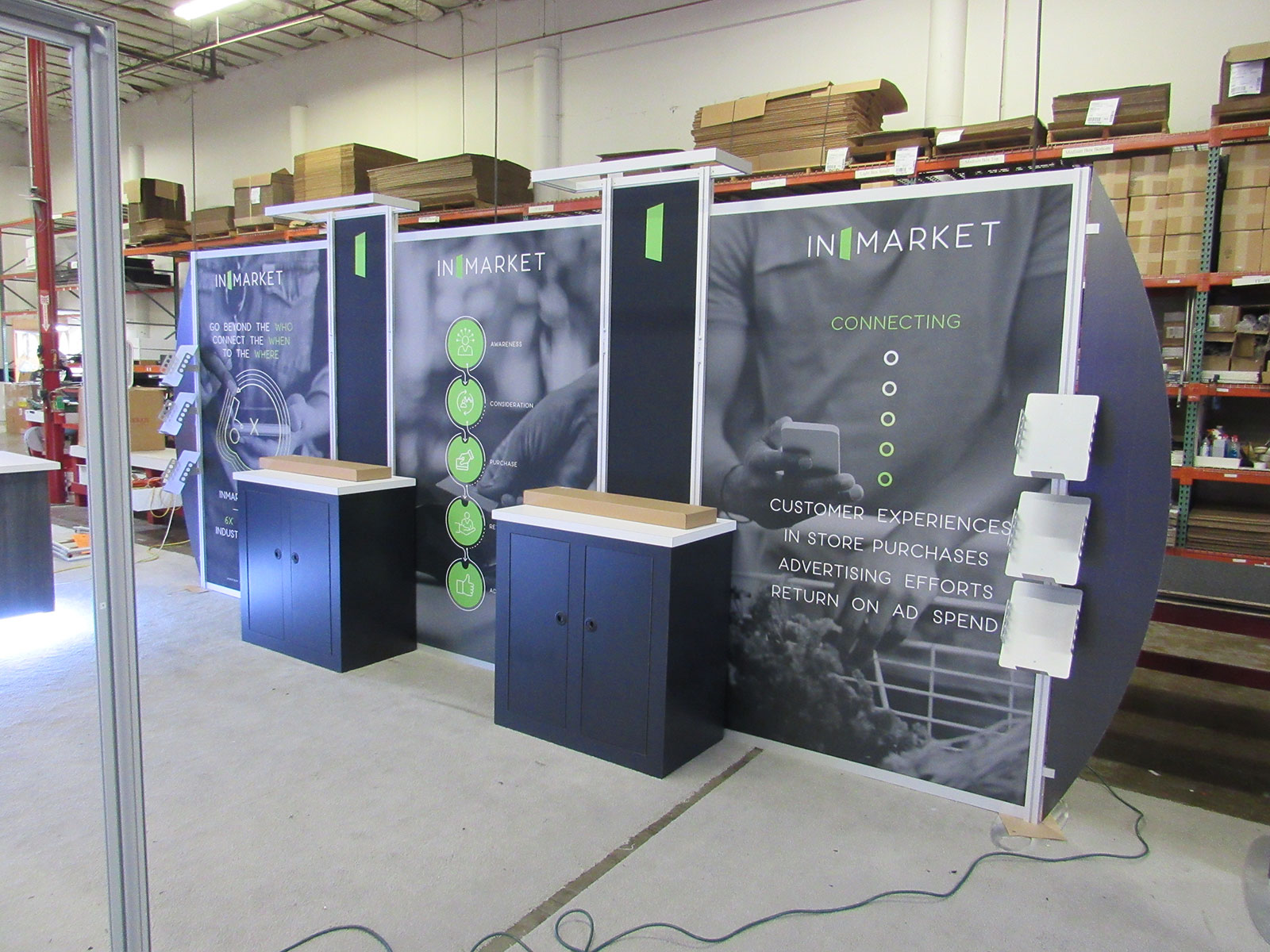 ECO-2108 Sustainable Exhibit with Fabric Graphics, Aluminum Extrusion Structure, (2) Monitor Mounts, (6) Aluminum Literature Trays, and (2) Counters with Locking Storage ECO-2108 Sustainable Exhibit -- 10 ft. Version