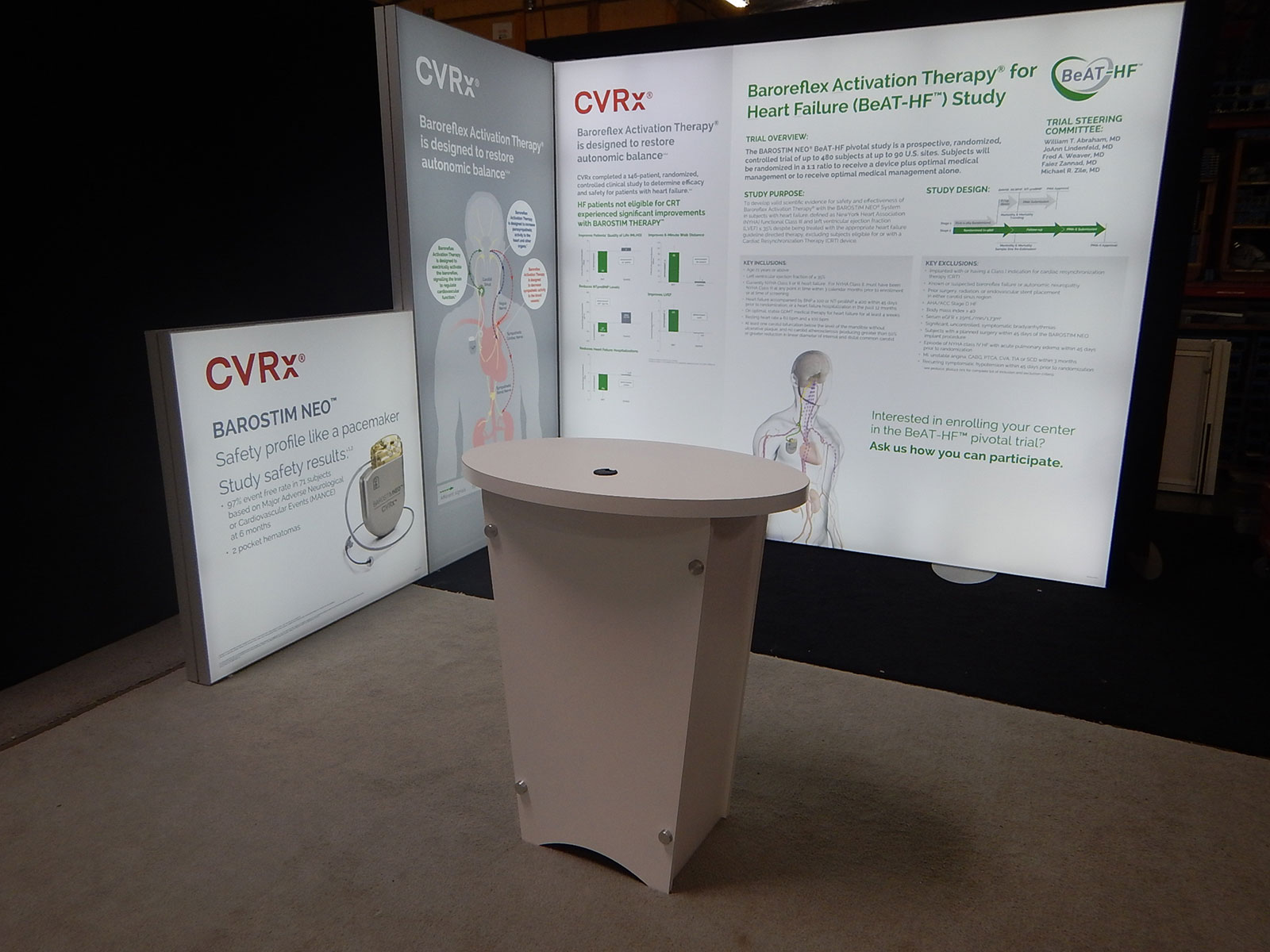 RENTAL: LED Backlit Exhibit with RE-1201 Tapered Counter and Silicone Edge Backlit Fabric Graphics RENTAL: RE-1201 Tapered Counter with Locking Storage