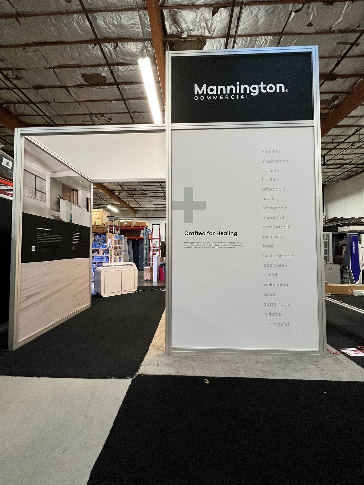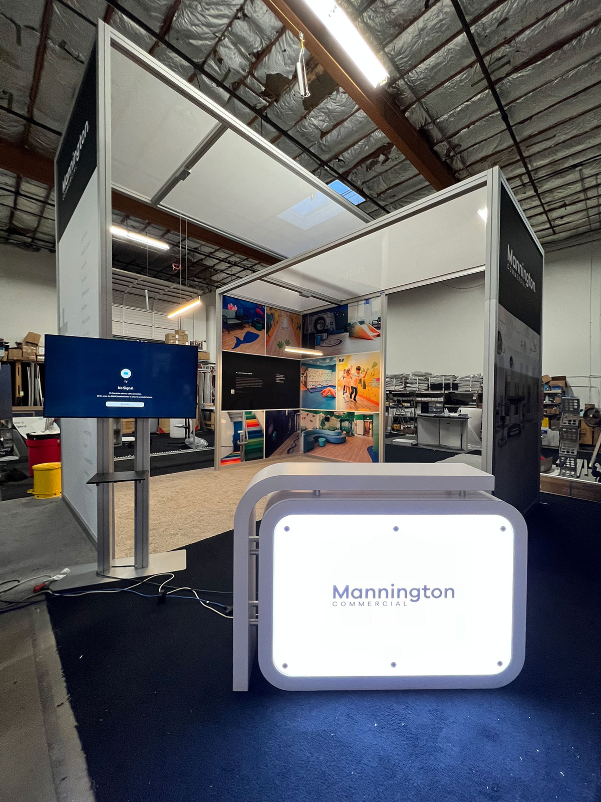 RENTAL: Modified RE-9087 Island Design with (2) Ceiling Canopies with Scrim Fabric @ 16 Ft and 12 Ft High, (1) RE-1568 Backlit Reception Counter, Large Monitor Stand, 50 Inch Monitor, Custom Pendant Lighting Assembly, and Silicone Edge Fabric Graphics.
