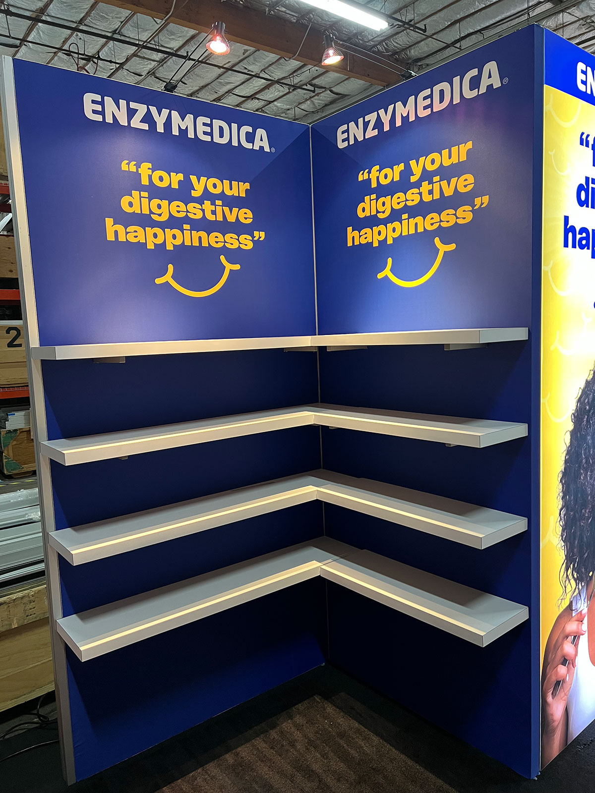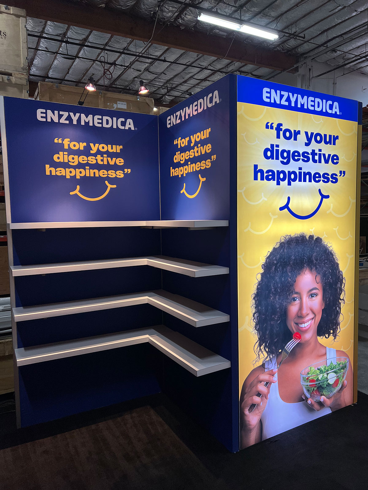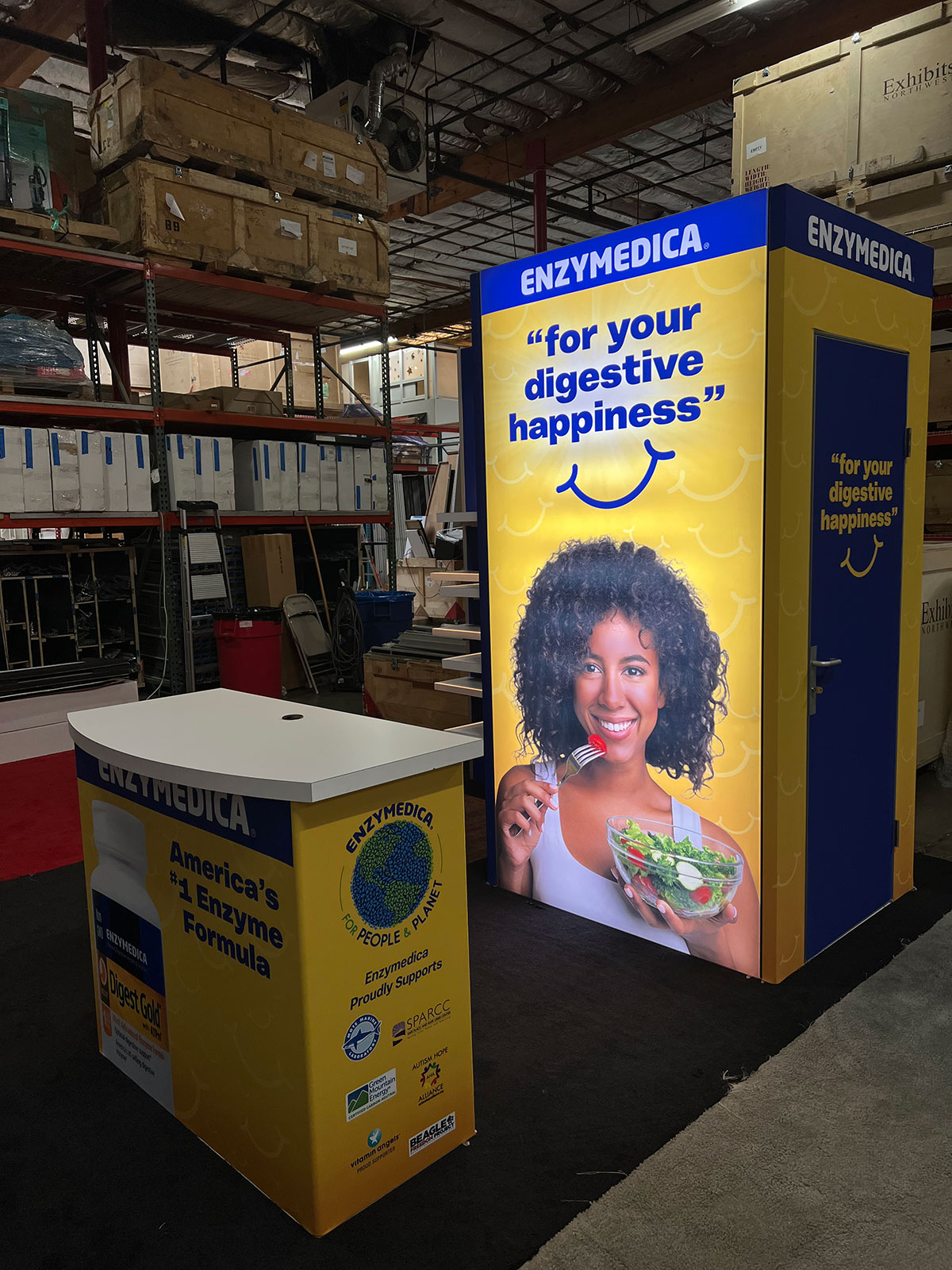 RENTAL: Modified RE-1064 Inline Gravitee System Design with Storage Closet with Locking Door, Lightbox, (8) White Laminated Shelves, RE-1558 Reception Counter, (2) LED Arm Lights, and Silicone Edge Fabric Graphics.