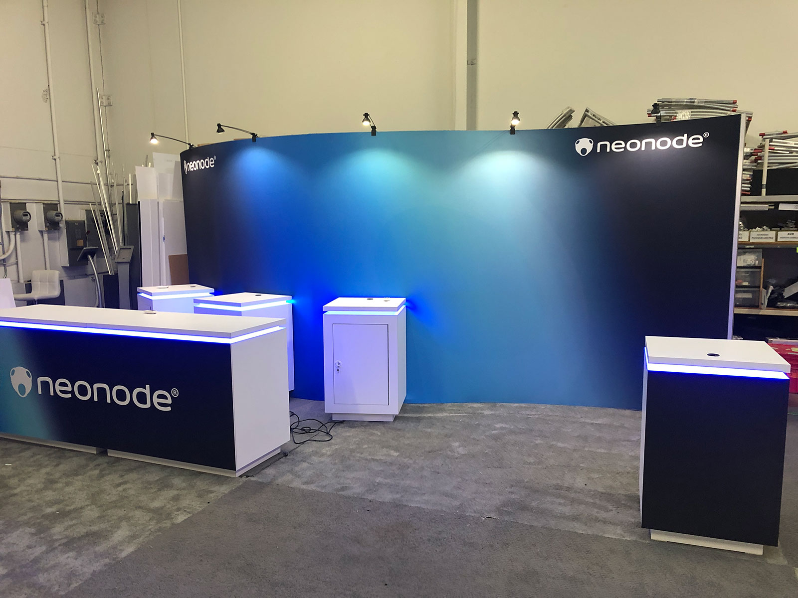 RENTAL: Curved Gravitee Panel System Backwall Design with (4) RE-1575 White Laminated Workstation Counters, (2) Side by Side RE-1576 Reception Counters with Front Direct Print Sintra Graphic, (5) Arm Lights, SEG Fabric Graphic, and Vinyl Applied Graphic