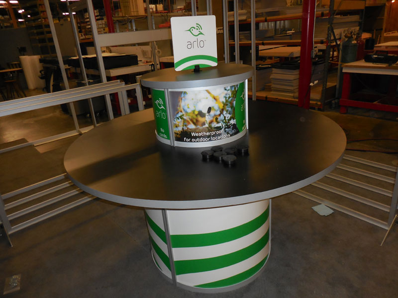 Custom Round Demo Counter with 72" Laminated Top and Rotating Sign